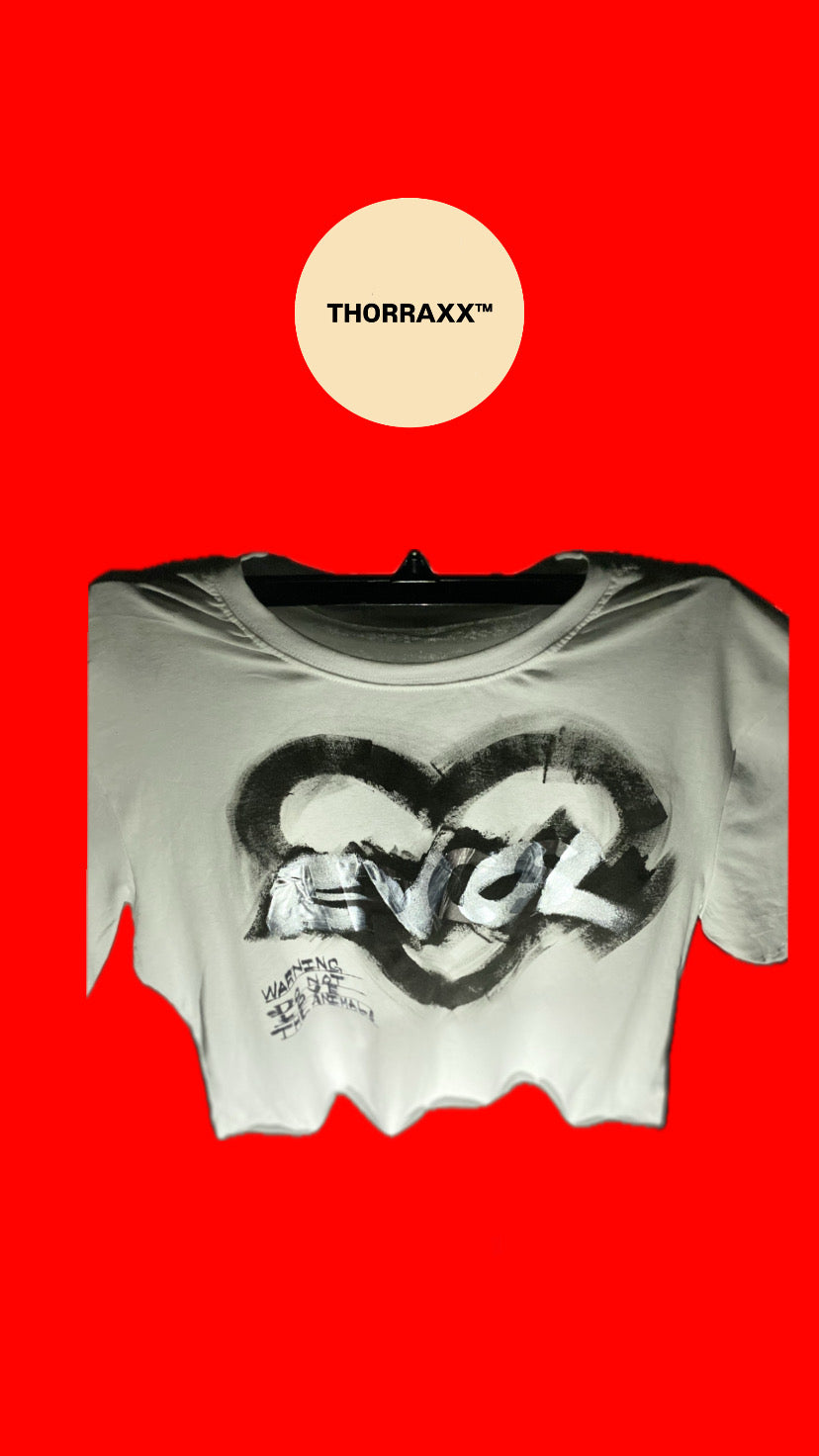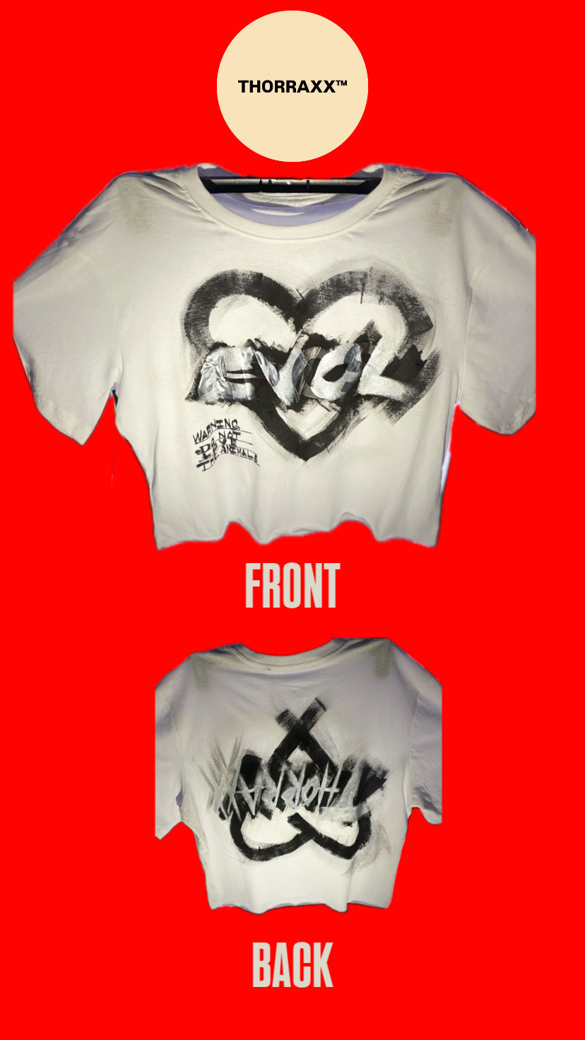 Box-cut, cropped t-shirt by THORRAXX™, hand-painted with a bold “EVOL” heart graphic on the front and mirrored design on the back. Features original text: “WARNING: DO NOT LOVE THE ANIMALS.” 100% cotton. One-of-one collectible. Heat-sealed and wash-safe.